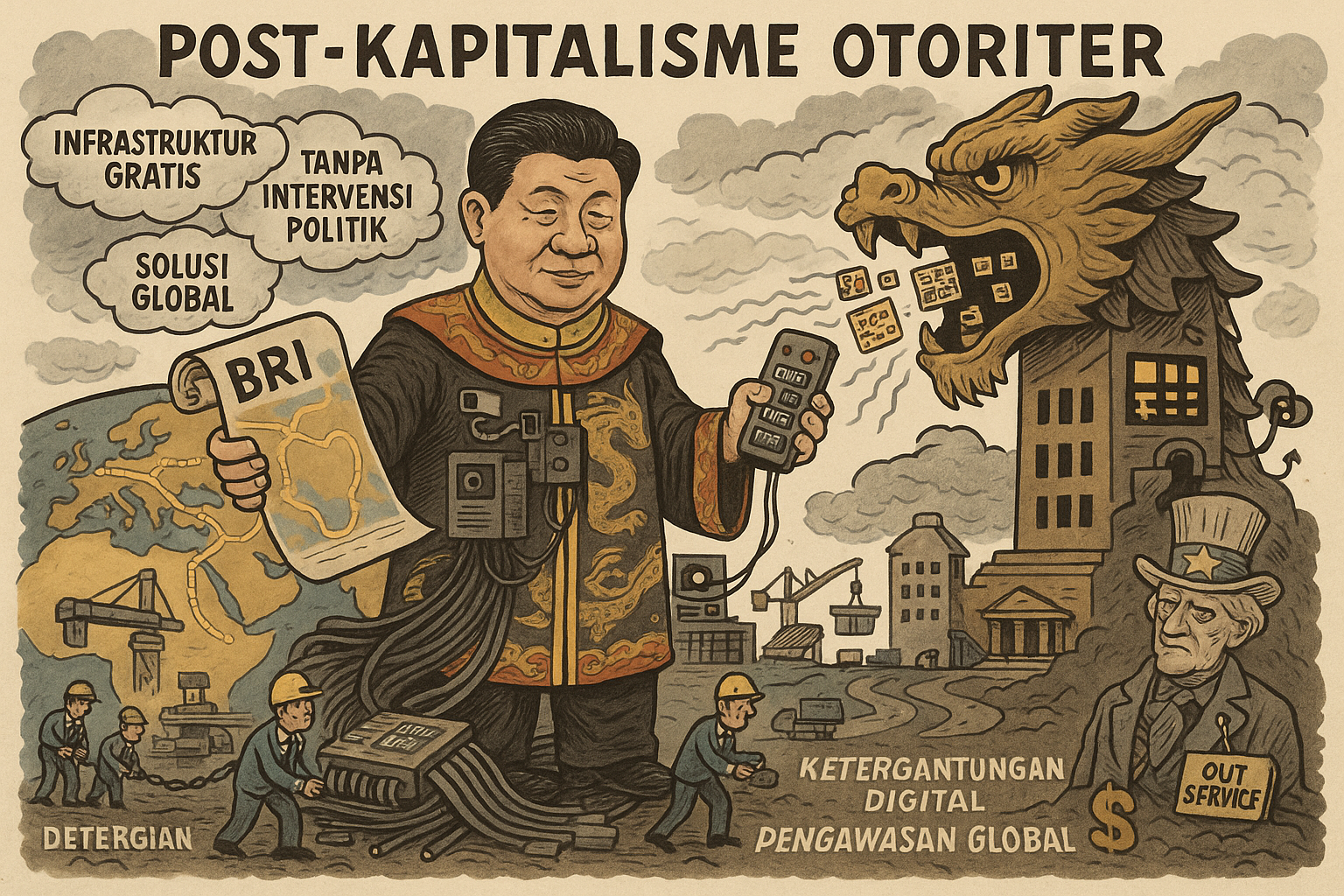 Model ini menjelma menjadi arsitektur kekuasaan yang tidak membutuhkan ideologi untuk menundukkan, melainkan cukup menyediakan infrastruktur yang menjanjikan efisiensi. Bagi negara-negara berkembang yang rentan terhadap instabilitas politik, janji ini sangat menggoda: stabilitas tanpa demokrasi, ketertiban tanpa deliberasi, kehadiran negara tanpa subjek. Ini menggeser definisi politik dari ranah ide ke ranah interoperabilitas. Maka, post-kapitalisme otoriter ala Cina bekerja bukan dengan memperluas kebenaran, tetapi dengan memperluas protokol. Yang ditanamkan ke dalam institusi negara-negara lain bukan narasi Cina, melainkan operational compatibility terhadap sistem yang secara diam-diam mematikan ruang munculnya subjek.