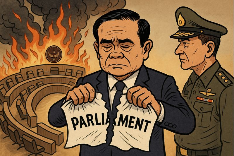 Konstitusi 2017—yang hingga 2025 masih menjadi kerangka hukum aktif—memperkuat struktur ini melalui ketentuan bahwa Senat yang sepenuhnya ditunjuk militer memiliki peran dalam memilih perdana menteri. Ini bukan sekadar desain konstitusional, tetapi arsip genealogi yang menunjukkan bahwa negara secara sadar memproduksi struktur legal yang membatasi dinamika politik elektoral. Dengan latar seperti ini, pembubaran parlemen 2025 bukanlah reaksi spontan terhadap krisis, tetapi langkah yang terhubung pada sejarah panjang di mana negara memproduksi wacana penyelamatan bangsa untuk mengatur ulang demokrasi.